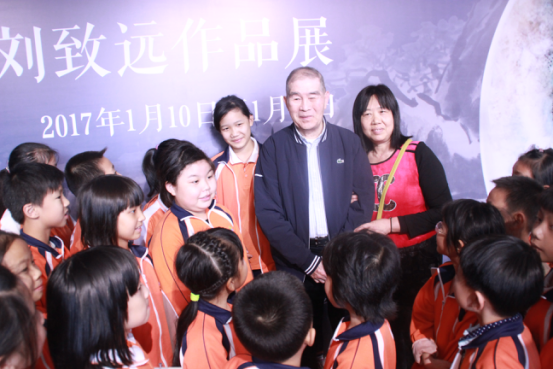 展覽現(xiàn)場(chǎng),高勵(lì)節(jié)與以其父親名字命名的“劍父小學(xué)”學(xué)生們合影