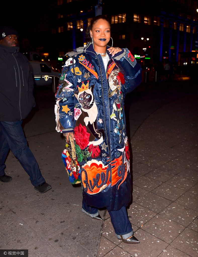 蕾哈娜印花羽絨服色彩斑斕 藍唇狂野