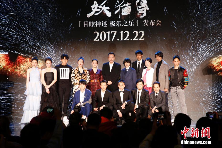 12月17日,由陳凱歌導(dǎo)演的賀歲奇幻題材電影《妖貓傳》在北京舉行全球首映發(fā)布會(huì),導(dǎo)演陳凱歌,制片人陳紅攜主演黃軒、染谷將太、張雨綺、秦昊、張榕容、張魯一、劉昊然、阿部寬、松坂慶子等亮相。影片改編自日本作家夢(mèng)枕貘的魔幻系列小說《沙門空海》,將于22日起在中國內(nèi)地上映。圖為眾主創(chuàng)合影。