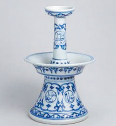 這是一件明正德年間的青花燭臺(tái)。燭臺(tái)很復(fù)雜,由四部分組成,最上端為蠟燭插口,外壁繪如意云頭紋;其下為燭臺(tái)細(xì)長(zhǎng)支柱,中部繪圓形開光,開光內(nèi)書寫阿拉伯文,上下分別繪勾蓮花枝紋及菱形紋。再下為承托圓盤,也繪如意云頭紋;最下端為喇叭形臺(tái)座,也繪圓形開光,開光內(nèi)書寫阿拉伯文,開光上下分別繪勾蓮花枝紋及菱形紋。燭臺(tái)上的阿拉伯文與傳統(tǒng)紋飾,表現(xiàn)出阿拉伯文化與中華傳統(tǒng)文化的交融。