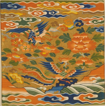 鸞鳳與牡丹、湖石、祥云相配稱(chēng)“鳳穿牡丹”或“鳳戲(喜)牡丹”,佳節(jié)初歲時(shí)寓意四季平安、富貴吉祥。而成對(duì)出現(xiàn)的鳳凰與花卉又有贊頌夫婦恩愛(ài)、富貴白頭之意。現(xiàn)藏美國(guó)大都會(huì)博物館的明人緙絲鳳穿牡丹方補(bǔ)原綴明代內(nèi)命婦吉服,穿用于慶典朝會(huì)。方補(bǔ)中一對(duì)緙絲彩鳳被安置在山花樹(shù)石佳景之中,叢生的靈芝、山茶、梅花、牡丹皆有吉祥寓意。這樣題材的緙絲補(bǔ)子亦見(jiàn)清華大學(xué)藝術(shù)館藏,可見(jiàn)在明代使用富有節(jié)慶特色的補(bǔ)子頗為常見(jiàn)。