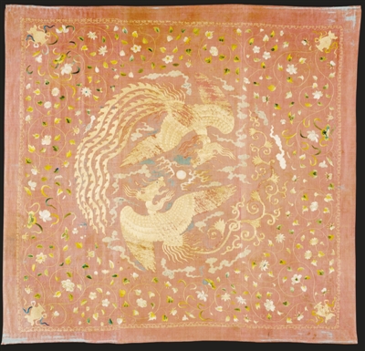 明清時(shí)期,羽翼華麗的鳳凰從遙遠(yuǎn)的天上下降凡間,將一切美好灑向人間,這一時(shí)期織物上常見(jiàn)以纏枝花卉紋樣搭配鸞鳳、對(duì)鳳之裝飾手法,或配上菊花、蓮花、牡丹等人們喜聞樂(lè)見(jiàn)的四季平安花卉,鳳穿牡丹、鳳踏蓮花、龍鳳翔云等等吉祥紋樣以寫(xiě)實(shí)手法細(xì)膩的表現(xiàn),無(wú)疑體現(xiàn)古人的思想和審美。
