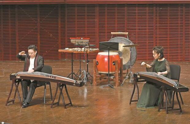 葉小綱創(chuàng)作的古箏獨奏曲《林泉》,可謂清新脫俗,奔涌跌宕,用多種創(chuàng)作手段和高難的演奏技法,將自然界晦明更迭、晴雨接踵、清泉潺潺、惡風獵獵的生動景象加以細致描摹,給古箏的藝術表現(xiàn)帶來更多的可能性。宋心馨功底好,善表演,表現(xiàn)出人琴合一、情音互融的美好意象。筆者這一代愛樂者大都聽過劉文金的二胡名曲《豫北敘事曲》,此次演奏的是這位民樂大師生前創(chuàng)作的無伴奏二胡二重奏《火·彩衣姑娘》。劉老此曲一改長期延用的傳統(tǒng)路線而風格大變,透露其晚年依然旺盛的創(chuàng)新活力。宋飛師徒身著紫、青兩色連衣裙玉立演奏,“風吹仙袂飄飄舉”,細膩呈現(xiàn)出此曲熱烈、浪漫、溫柔、含蓄的豐富層次,從作品到臺容都給人全新的藝術感受。