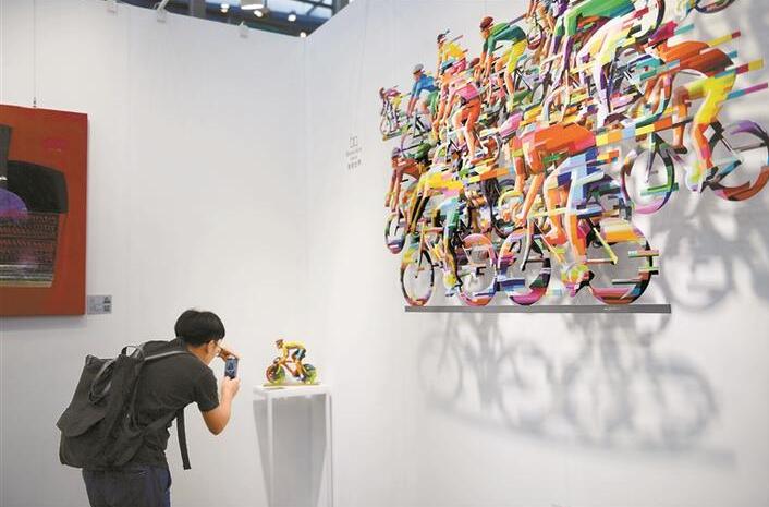 參展商“譽美國際”的展臺外墻上,一場疾馳中的跑馬比賽正酣。將不銹鋼板切片組合,飾以熱情而愉悅的色彩,這兩組風(fēng)格極具個性化的墻面雕塑作品,均來自以色列國寶級藝術(shù)家大衛(wèi)·格斯坦,引得不少觀眾駐足欣賞。