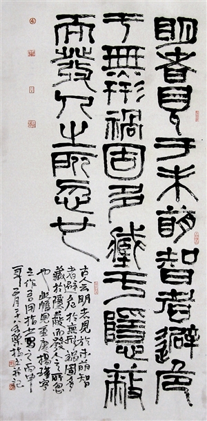 王和平以手指蘸墨,以手為筆,或疾或緩,不到十分鐘,一幅恰似石鑿雕刻力透紙背的書法作品躍然紙上,其變幻莫測(cè)的創(chuàng)作手法和獨(dú)特風(fēng)格令人叫絕。顯然,用手指畫的難度比用筆畫大得多。一般書寫一個(gè)字需要用手指蘸墨幾次以上,但又必須使字形整體合理自然,筆畫形式流暢靈動(dòng),不至于顯露手工痕跡,不至于給人以呆滯和工藝性強(qiáng)的感覺。要恰到好處地體現(xiàn)筆畫的緊湊、粗細(xì)、虛實(shí)、枯榮,是一件很不容易的事。功夫全在指頭,既非一日之功,也非人人可以練就。
