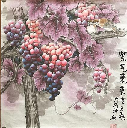 仔細(xì)觀察他筆下的葡萄,那密密實(shí)實(shí)、郁郁蔥蔥的葉子下,葡萄掛滿了架。有的紫紅色,有的青綠色,像瑪瑙,晶瑩剔透的葡萄讓人饞涎欲滴,期間引來(lái)雀鳥駐足枝頭,享受著秋收的喜悅和精彩。賀天飛坦言,葡萄題材的創(chuàng)作并非一件易事。在四十多年中,他只畫了九十多幅葡萄圖。一幅斗方的葡萄他通常都要畫上五天到一周。此次展出的作品匯聚了五年來(lái)他對(duì)這一題材的創(chuàng)作成果。