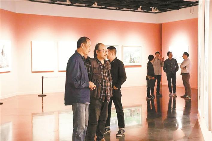 藝術(shù)家們在觀展切磋。