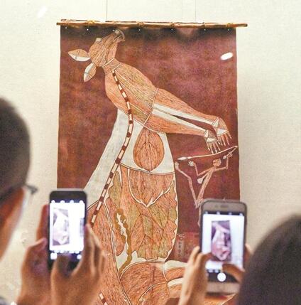 樹皮畫是人類一項古老的藝術(shù),也是澳大利亞原住民延續(xù)保留至今的一種藝術(shù)形式。澳大利亞的樹皮畫承載了深厚的文化和思想內(nèi)涵,被稱為是“活著的”原始繪畫。本次展覽展示了位于澳大利亞北海岸線的阿納姆地原住民藝術(shù)家創(chuàng)作的120余件樹皮繪畫,以及繪制工具、木雕木刻等,反映了澳大利亞原住民對世界的理解和認(rèn)識,以及他們的生活習(xí)俗、精神世界與文化傳統(tǒng),也展現(xiàn)了澳大利亞原始藝術(shù)的鮮明特色。