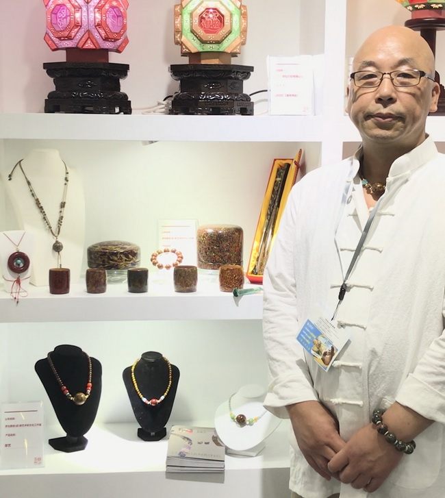 浙江省組團(tuán)的展位在會(huì)展中心2號(hào)館,規(guī)模不小,羅獻(xiàn)兵老師的漆藝作品都比較精致,但展位卻比較舒展。一眼望去,五彩斑斕的漆藝作品令人眼花繚亂,精神為之一震,主要作品有犀皮漆扇、印盒、糖果盒、竹胎茶杯、腰墜以及手串和漆珠等。前來參觀的人不少,但從他們的言談中得知了解的并不多,多為其絢麗的光彩所吸引。