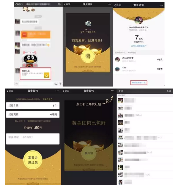 我們也可以在微信群里發(fā)紅包,基于風(fēng)險控制及消費(fèi)者權(quán)益保護(hù)的相關(guān)要求,“黃金紅包”采取了一個不超過1克的限制。