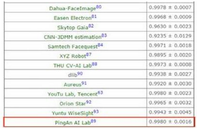 5月9日,國際權(quán)威人臉識(shí)別數(shù)據(jù)庫LFW(Labeled Faces in the Wild)最新公布的測試結(jié)果顯示,平安集團(tuán)旗下平安科技的人臉識(shí)別技術(shù)以99.8%的識(shí)別精度和最低的波動(dòng)幅度領(lǐng)先國內(nèi)外知名公司,位居世界第一。該精度為LFW所公布的最佳成績,也是平安科技人工智能實(shí)驗(yàn)室取得的里程碑式成果。此外,經(jīng)國家公安部第三研究所認(rèn)證中心權(quán)威認(rèn)證,平安科技人臉識(shí)別技術(shù)同樣獲得識(shí)別精度99.84%的檢測結(jié)果,并榮獲檢測報(bào)告證書。