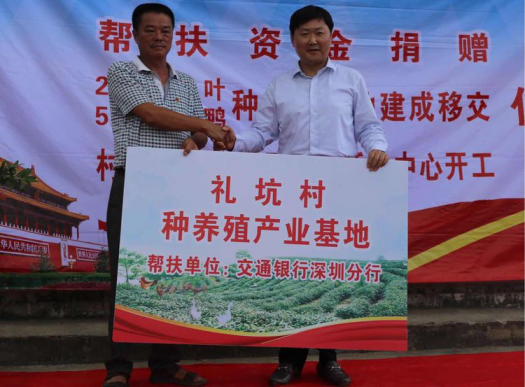 當日,交通銀行深圳分行籌劃建設(shè)的茶山、種養(yǎng)殖基地、新一批雞苗和2017年度專項扶貧資金正式移交和撥付給禮坑村,并舉行了村民文化廣場開工奠基典禮。陳隃表示,交行深圳分行把幫扶禮坑村做為落實黨的政策的重點工作,做為國有銀行承擔(dān)政治責(zé)任、社會責(zé)任的重要出發(fā)點,做為加強黨的建設(shè)的重要抓手,下一步圍繞三個轉(zhuǎn)變繼續(xù)深化扶貧工作,一是工作目標轉(zhuǎn)向社會主義新農(nóng)村建設(shè),努力將禮坑村建設(shè)成新農(nóng)村建設(shè)示范村中的示范點;二是工作方法從貧困戶脫貧向產(chǎn)業(yè)脫貧轉(zhuǎn)變,繼續(xù)發(fā)掘新項目,形成更加持續(xù)化的產(chǎn)值和收益;三是在制度建設(shè)上下功夫,強化社會主義新農(nóng)村建設(shè)的制度先行和制度示范。