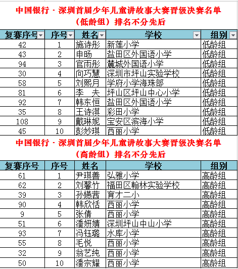 從全市近百所學(xué)校、社會賽區(qū)報名的萬余名參賽選手中脫穎而出的選手們齊聚復(fù)賽賽場,比賽競爭異常激烈。晉級復(fù)賽的225人(其中高齡組104人,低齡組121人)使出渾身解數(shù),講述著自己喜歡的故事,最終高、低齡組每組各10人晉級決賽,低齡組新蓮小學(xué)施詩彤、鹽田區(qū)外國語小學(xué)申旸等10位選手,高齡組弘雅小學(xué)尹琪善、福田區(qū)翰林實驗學(xué)校劉馨竹等10位選手“殺出重圍”,奪得決賽名額。