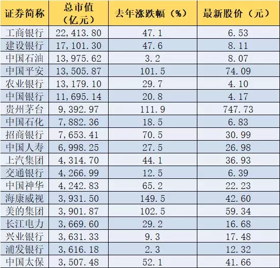 據(jù)匯大數(shù)據(jù)終端統(tǒng)計(jì),截止到今年3月20日,中國(guó)平安的市值為1.35萬(wàn)億,僅次于工商銀行、建設(shè)銀行和中國(guó)石油。在市值排名前20名的公司中,去年全年股價(jià)漲幅在100%以上的公司僅有4家,分別是??低?、貴州茅臺(tái)、美的集團(tuán)和中國(guó)平安,漲幅分別為149.5%,111.9%、102.5%和101.5%。