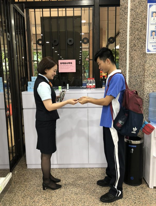 中午時分,一位紅嶺中學(xué)的考生在銀行大堂經(jīng)理的熱情招呼下免費領(lǐng)取了文具盒礦泉水。通過聊天,這位考生表示今天上午考得很好,對建行的助力高考愛心驛站服務(wù)表示感謝。(通訊員 梁莉)
