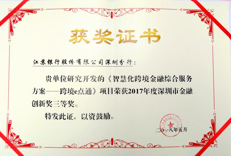 深圳新聞網(wǎng)訊 日前,深圳市政府2017年度金融創(chuàng)新獎(jiǎng)評(píng)選結(jié)果揭曉,江蘇銀行深圳分行“智慧化跨境金融綜合服務(wù)方案—跨境e點(diǎn)通”項(xiàng)目斬獲三等獎(jiǎng),這是該行連續(xù)四年獲得金融創(chuàng)新獎(jiǎng)后再次獲此殊榮,該行也由此成為深圳地區(qū)唯一一家五次榮獲金融創(chuàng)新獎(jiǎng)的城商行。
