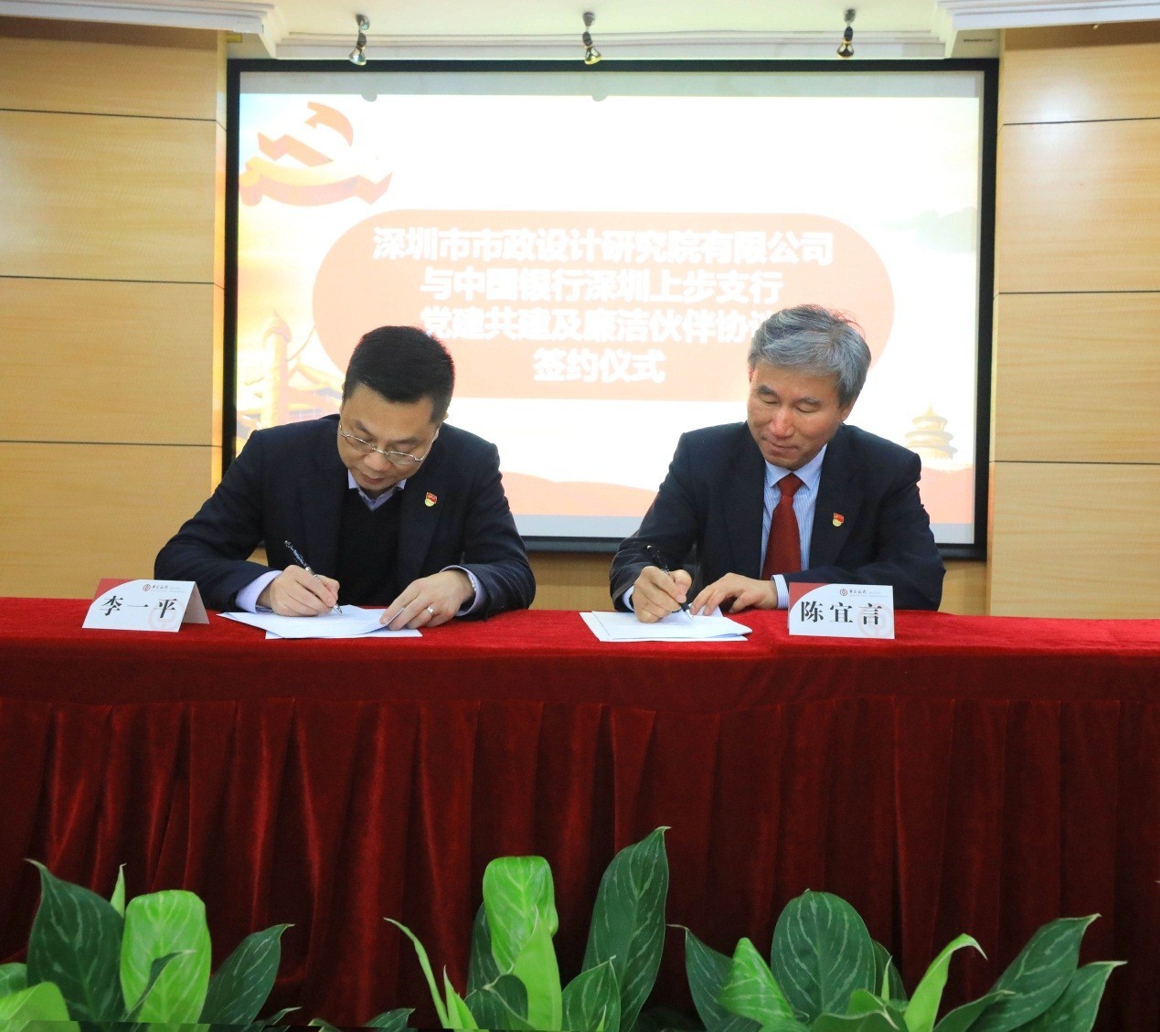 演講結(jié)束后,李一平和陳宜言分別代表中國銀行深圳上步管轄支行黨委和深圳市市政設(shè)計研究院有限公司黨委簽署了黨建共建和廉潔伙伴合作協(xié)議。