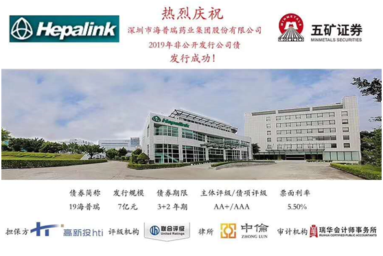 據悉,此次私募債券“19海普瑞”發(fā)行規(guī)模為7億元,期限3+2年,票面利率5.5%。在深圳高新投的助力下,債券募集過程中,得到了各大金融機構的踴躍認購,獲得2倍超額認購額,5.5%的票面利率也創(chuàng)下近期AA+民營企業(yè)發(fā)債利率新低。