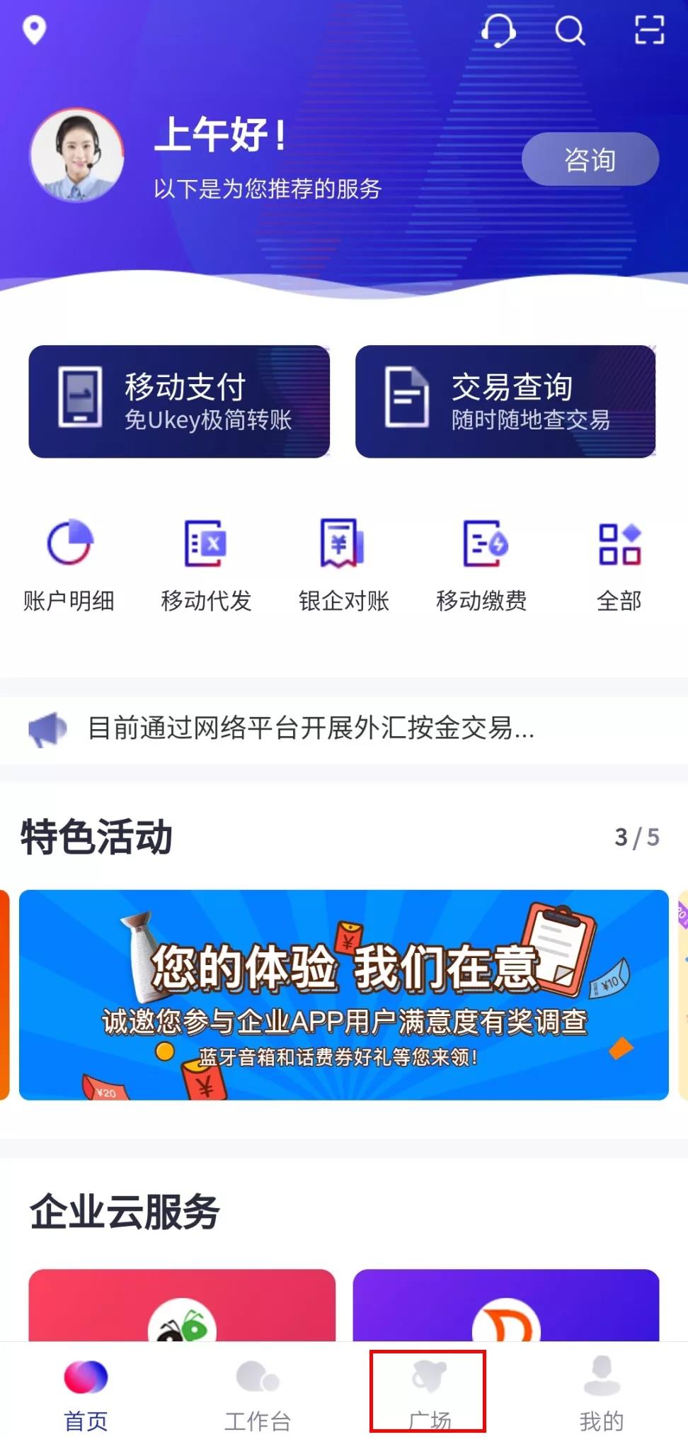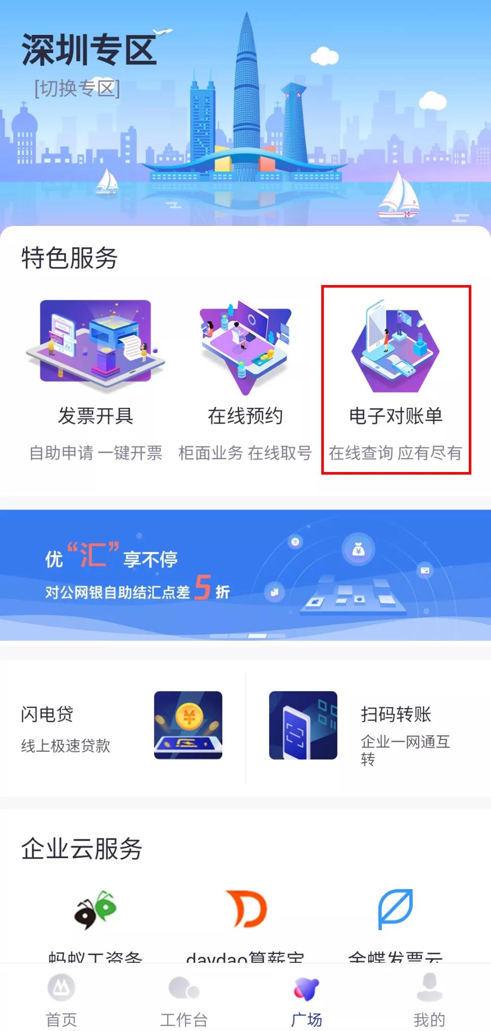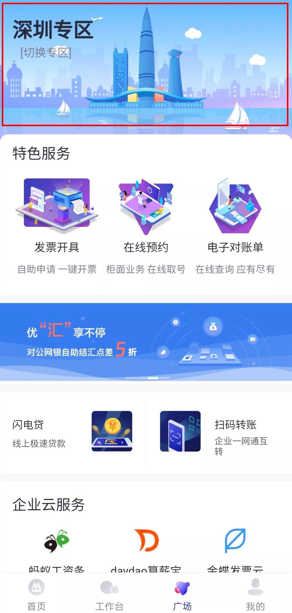 打開招商銀行企業(yè)App,點(diǎn)擊“廣場”板塊,找到深圳專區(qū)。