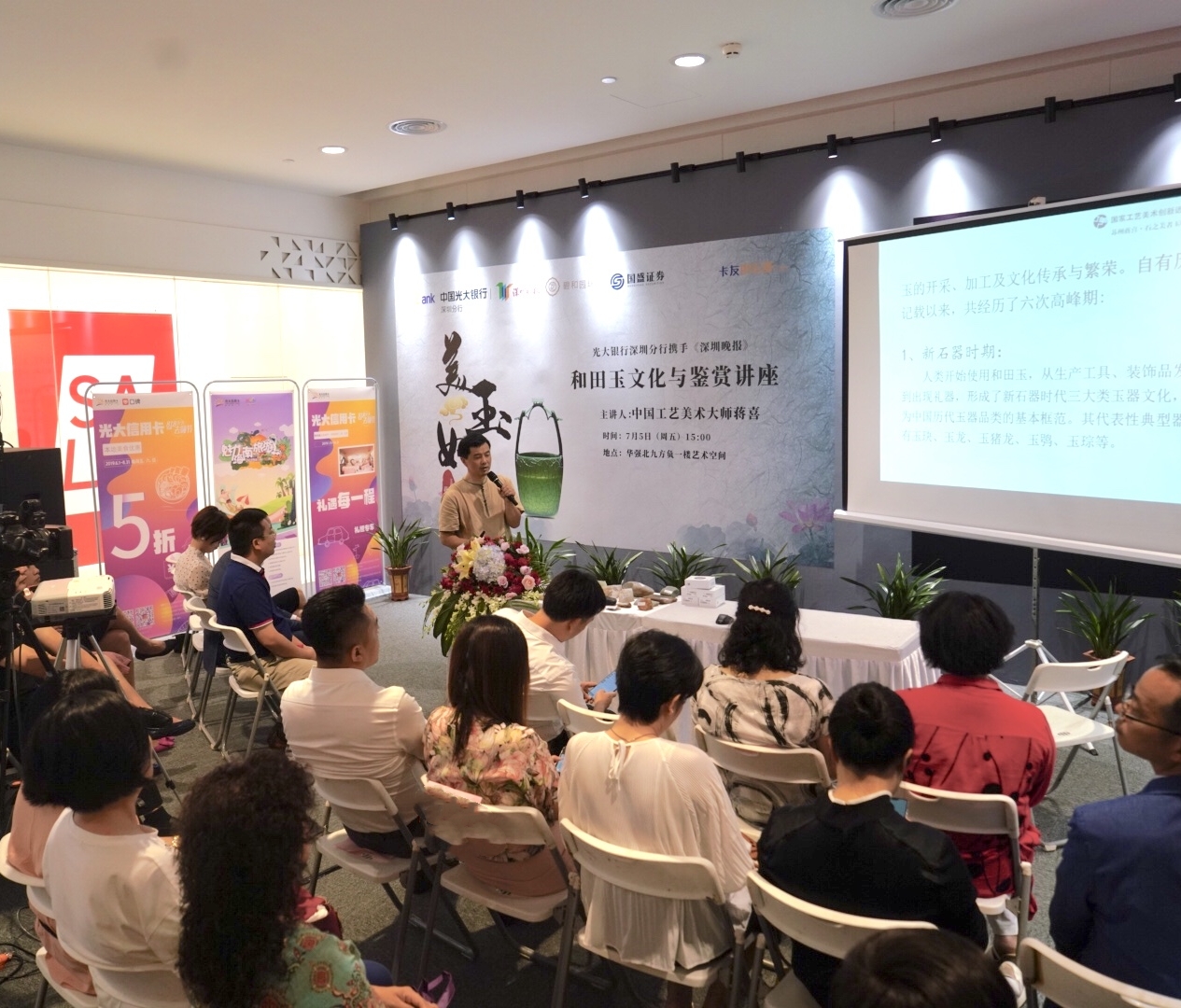 在講座中,蔣喜先生圍繞美玉初探;師古而不擬古——貴在創(chuàng)新等內(nèi)容進行了分享,對當(dāng)代玉雕創(chuàng)作中的師古與創(chuàng)新進行了深入淺出的講解,讓現(xiàn)場嘉賓獲益匪淺。在講座現(xiàn)場,光大銀行深圳分行的工作人員為到場嘉賓介紹了個人理財、私行業(yè)務(wù)、出國金融、信用卡業(yè)務(wù)等多個產(chǎn)品業(yè)務(wù),讓聽眾對光大銀行金融產(chǎn)品有了更深入的了解。