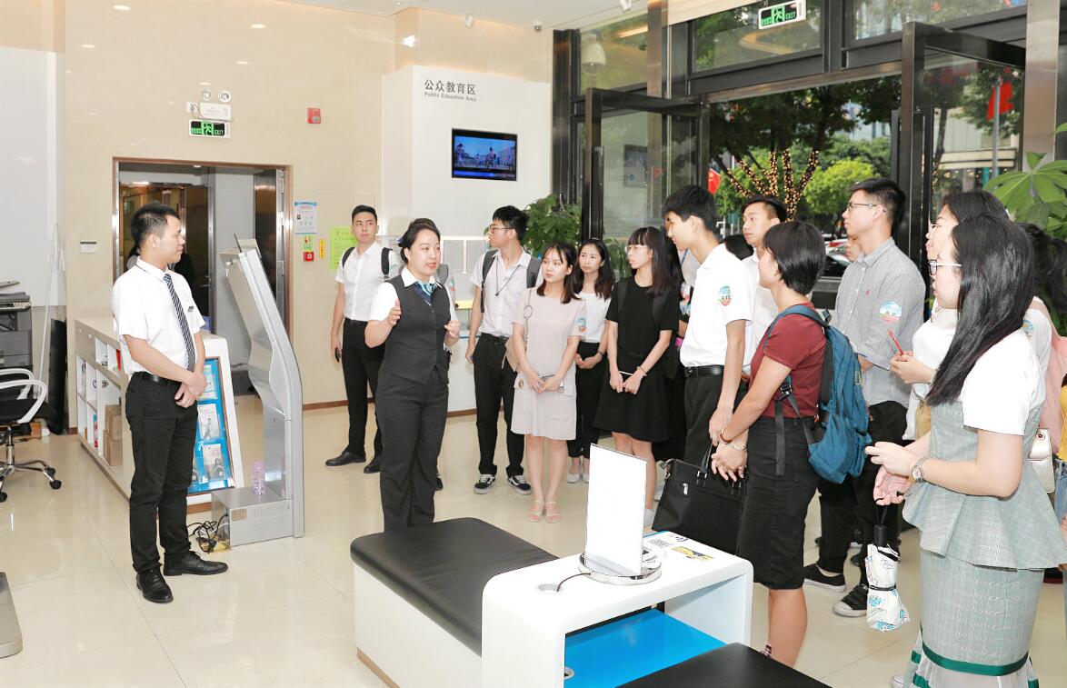 開放日活動的第二站,同學(xué)們來到沙井支行營業(yè)部、沙井坣崗支行和福田支行營業(yè)部學(xué)習(xí)了銀行營業(yè)網(wǎng)點(diǎn)功能區(qū)布局、窗口設(shè)置、營業(yè)場所裝飾、智能設(shè)備配置及人員安排等情況,對銀行營業(yè)網(wǎng)點(diǎn)的工作環(huán)境有了更直觀的感受和體驗(yàn)。特別是在參觀沙井東塘支行的員工宿舍“職工之家”時(shí),同學(xué)們對這個(gè)占地1500平米、總建筑面積3200平米的獨(dú)立大院由衷贊嘆,向往不已。