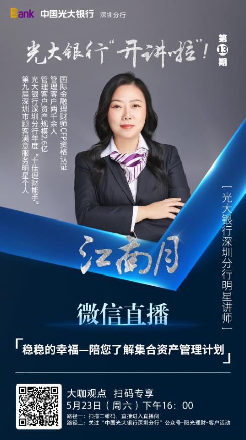 此次,光大銀行深圳分行攜手《深圳晚報》邀請CFP資格認證國際金融理財師、該行年度“十佳理財能手”、明星講師江南月帶來《穩(wěn)穩(wěn)的幸?!隳私饧腺Y產(chǎn)管理計劃》主題分享,幫助更多客戶深入了解并購買集合資產(chǎn)管理計劃產(chǎn)品。講師江南月將從集合資產(chǎn)管理計劃的基本概念和產(chǎn)品優(yōu)勢出發(fā),深入淺出,讓更多客戶了解集合資產(chǎn)管理計劃產(chǎn)品,并幫助客戶選擇購買這類產(chǎn)品。該行代銷的純債類集合資產(chǎn)管理計劃一直以來都以穩(wěn)健著稱,目前已到期產(chǎn)品全部達到了業(yè)績比較基準,設(shè)置超額收益的產(chǎn)品也都為客戶實現(xiàn)了超額回報。