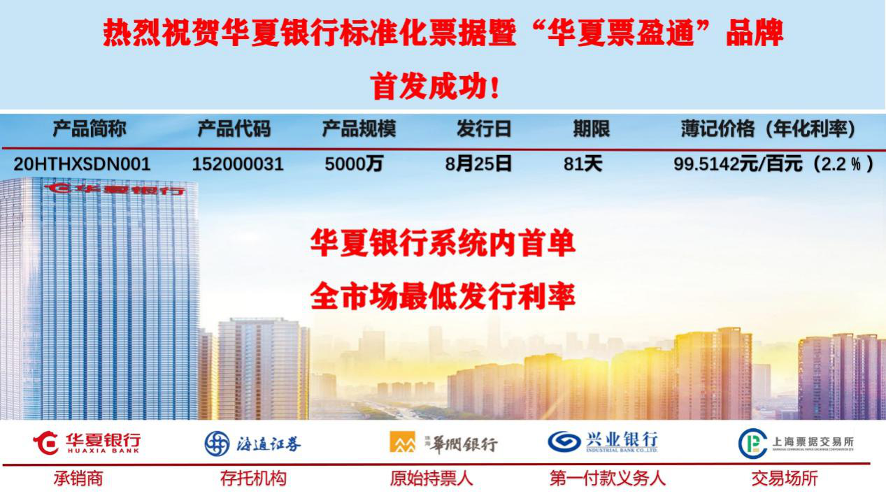 深圳新聞網(wǎng)·見(jiàn)圳客戶(hù)端2020年8月25日訊 今日,在深圳特區(qū)成立40周年來(lái)臨之際,記者從華夏銀行深圳分行獲悉,由該行承銷(xiāo)的海通證券華夏票盈通2020年度第一期標(biāo)準(zhǔn)化票據(jù)產(chǎn)品(產(chǎn)品簡(jiǎn)稱(chēng):20HTHXSDN001)在該行系統(tǒng)內(nèi)率先成功發(fā)行。本期標(biāo)準(zhǔn)化票據(jù)發(fā)行規(guī)模5000萬(wàn),簿記價(jià)格99.5142元/百元面值(相當(dāng)于年化利率2.2%),發(fā)行利率創(chuàng)全市場(chǎng)可比同類(lèi)型、同期限產(chǎn)品新低,將以更低的融資成本支持“穩(wěn)企業(yè)保就業(yè)”工作。
