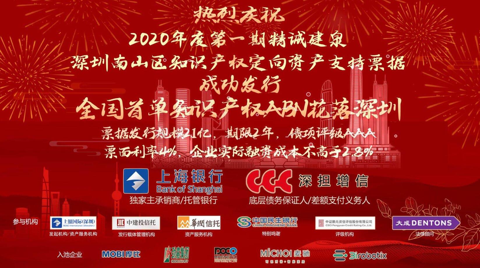 深圳新聞網(wǎng)·見圳客戶端2020年9月23日訊 昨日,隨著上海銀行股份有限公司主承的“上銀國際投資(深圳)有限公司2020年度第一期精誠建泉深圳南山區(qū)知識產(chǎn)權定向資產(chǎn)支持票據(jù)”成功發(fā)行,中國銀行間交易商協(xié)會首單民營科技中小企業(yè)專項知識產(chǎn)權ABN項目花落深圳。該項目不僅是對知識產(chǎn)權證券化的一次創(chuàng)新和實踐,也為中小民營科技企業(yè)開辟了一條在銀行間市場融資的新渠道。本期ABN共五家入池企業(yè),發(fā)行規(guī)模2.1億元,期限兩年,票面4%,經(jīng)南山區(qū)政府補貼和深圳擔保集團費用減免,入池企業(yè)實際融資成本低于年化2.80%。 一直以來,上海銀行以“精誠至上,信義立行”為核心價值觀,堅持“融智”與“融資”有機結合,以實體經(jīng)濟需求為導向,不斷推進產(chǎn)品創(chuàng)新,持續(xù)為實體經(jīng)濟發(fā)展提供更高質量、更有效率的金融服務。此次首單知識產(chǎn)權ABN項目花落深圳,不僅是深圳不斷強化金融創(chuàng)新所取得的重要成果,更是上海銀行探索服務深圳、服務實體經(jīng)濟新模式的重要實踐。