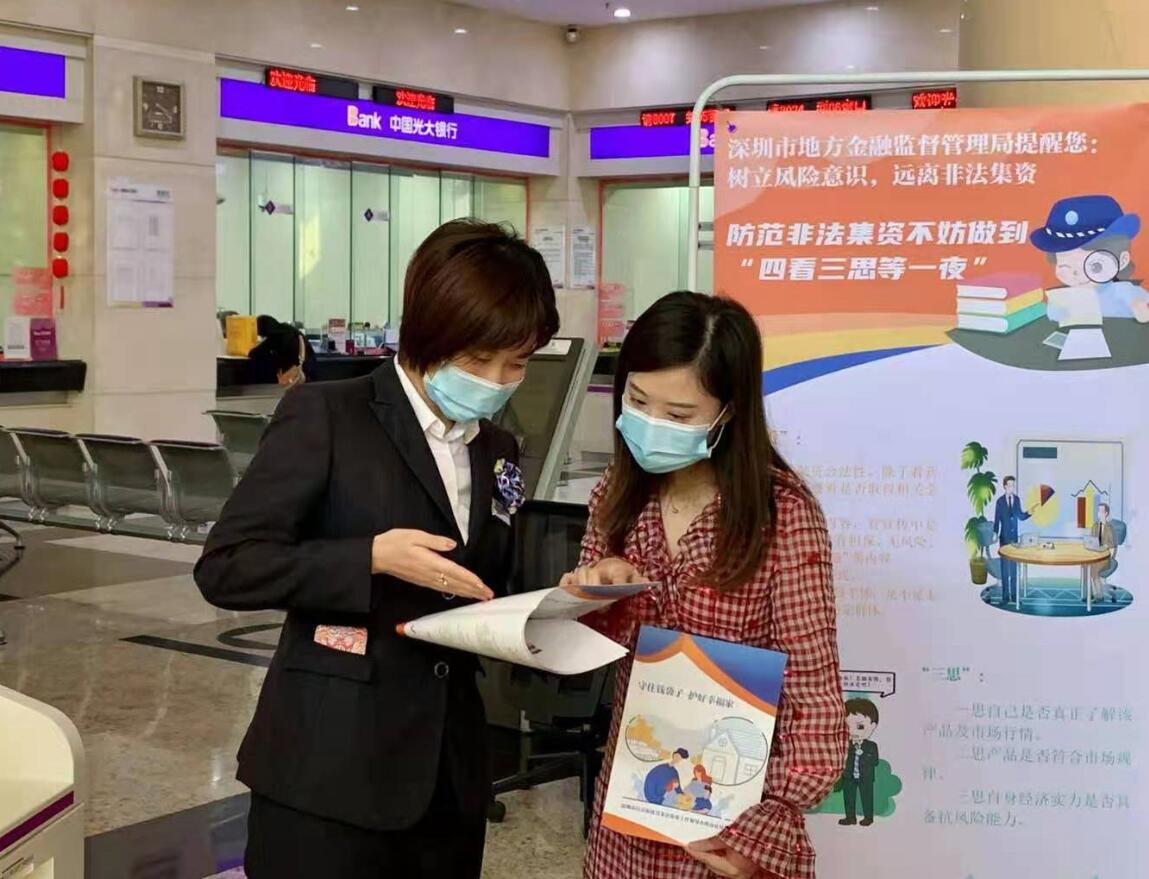 在活動開展期間,光大銀行深圳分行在網(wǎng)點擺放了防范非法集資的宣傳展架,并向前來辦理業(yè)務(wù)的市民主動發(fā)放防范非法集資宣傳手冊。宣傳冊上詳細介紹了非法集資相關(guān)的金融知識,包括非法集資的特征、表現(xiàn)形式和常見手段,摘錄了相關(guān)的法律法規(guī)和政策,用非法集資案例生動形象的說明危險就在身邊。該行網(wǎng)點員工還針對客戶提出的疑問給予詳細講解,并提醒客戶,遠離非法集資,守好自己的“錢袋子”。