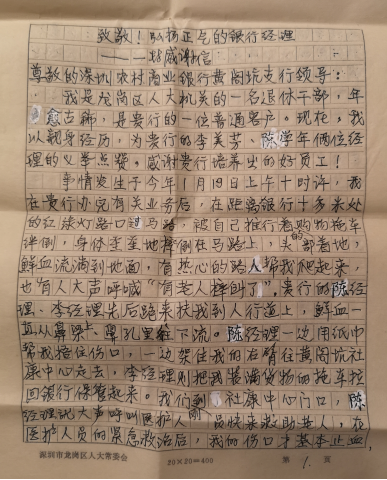 “事發(fā)第二天,該行行長(zhǎng)又派陳學(xué)年、李美芳兩位員工到我家探望、慰問,讓我全家非常感動(dòng)?!?月29日下午,傷口剛剛拆線的老人就帶著手寫的感謝信來到深圳農(nóng)商行黃閣坑支行,向幫助過他的兩位熱心人表達(dá)感謝之情。感謝信整整三頁紙,字跡工整,老人家的誠(chéng)摯感謝之意躍然紙上。