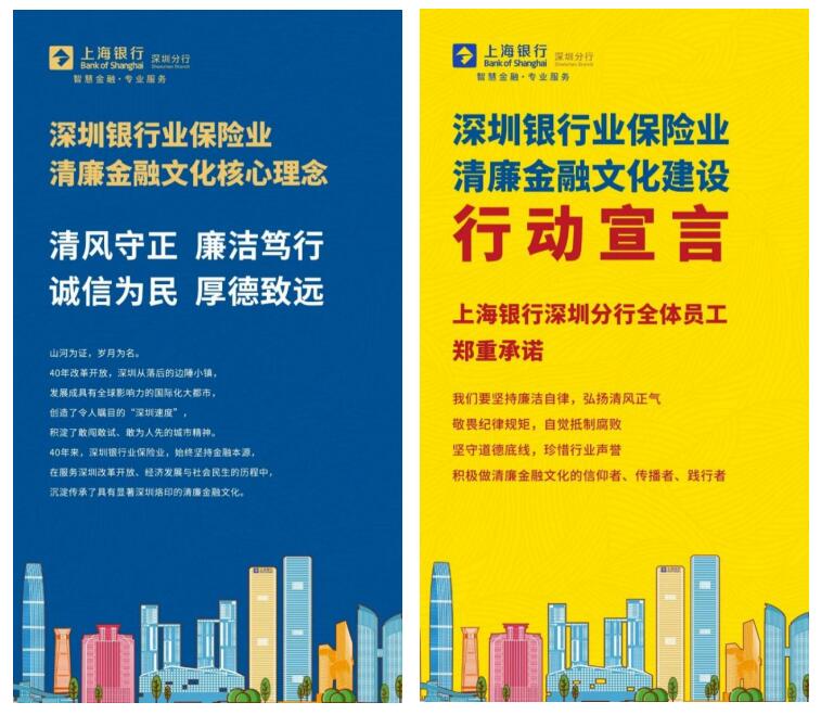 5月以來,上海銀行深圳分行按照深圳銀保監(jiān)局、深圳銀行業(yè)協(xié)會指導要求,秉持聯(lián)合性、統(tǒng)一性、持續(xù)性原則,統(tǒng)一啟動宣教行動日,在線上、線下等宣傳陣地多樣化宣傳標志性統(tǒng)一宣教文案,形成強烈的清廉金融文化宣教主題,營造濃厚宣教氛圍。統(tǒng)一在分行內(nèi)部電梯間LED屏、餐廳電視屏、各網(wǎng)點電視顯示屏等載體上投放清廉金融文化宣教視頻;統(tǒng)一在網(wǎng)點走馬燈展示“深圳銀行業(yè)保險業(yè)清廉金融文化核心理念—清風守正、廉潔篤行、誠信為民、厚德致遠”等宣教標語;發(fā)布分行自制清廉金融宣教海報,充分加入自身特色理念,融入我行智慧金融,專業(yè)服務(wù)的理念,并組織各單位在公眾號、微信、朋友圈積極學習轉(zhuǎn)發(fā),形成宣教合力。