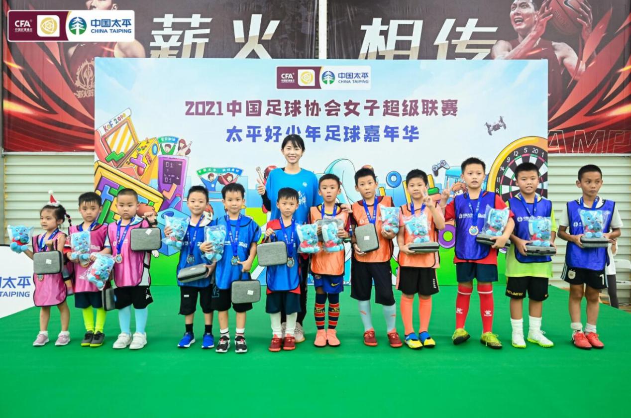 活動(dòng)現(xiàn)場,5-10歲的兒童分組進(jìn)行1V1趣味氣墊足球賽,經(jīng)過4輪激烈角逐,從參賽選手競選出12名選手被評(píng)為“太平好少年”稱號(hào),由熊熙女士親自頒獎(jiǎng),并從優(yōu)勝者中抽取幸運(yùn)球童獲得女足大禮包。除了氣墊足球賽之外,現(xiàn)場的小選手們還體驗(yàn)了多項(xiàng)趣味互動(dòng)游戲,也收獲了精美的參與禮品。