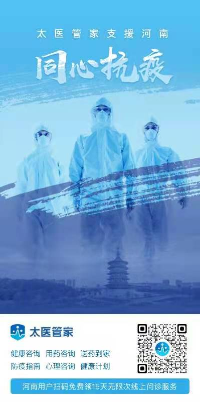 近日,河南地區(qū)出現(xiàn)多起疫情病例,為支援抗疫工作,幫助當?shù)鼐用褡龊媒】倒芾?,增強抗疫信心,太?;ヂ?lián)網(wǎng)醫(yī)院——太醫(yī)管家繼向西安市民開放免費線上問診通道后,再次定向河南地區(qū)居民推出在線問診服務(wù)。