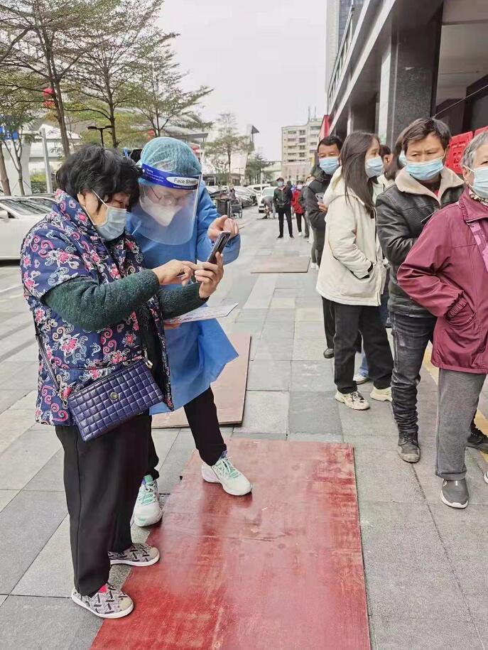 2月17日,景華社區(qū)公園核酸篩查檢測(cè)點(diǎn)。面對(duì)大量參與核酸檢測(cè)的市民,青年志愿者耐心做好指引解釋,指導(dǎo)群眾掃碼、采集信息,教居民操作檢測(cè)小程序,開展防疫宣傳,維護(hù)現(xiàn)場(chǎng)秩序,保障核酸檢測(cè)工作井然有序進(jìn)行。因核酸檢測(cè)點(diǎn)在居民區(qū),老年人較多,對(duì)核酸檢測(cè)登記小程序操作流程不熟悉,再加上是夜晚檢測(cè),現(xiàn)場(chǎng)光線不足,給服務(wù)工作帶來一些難題,但青年志愿者們沒有退縮,而是拿出在工作中服務(wù)客戶的勁頭,更細(xì)致、更耐心解決問題,做好志愿服務(wù)。