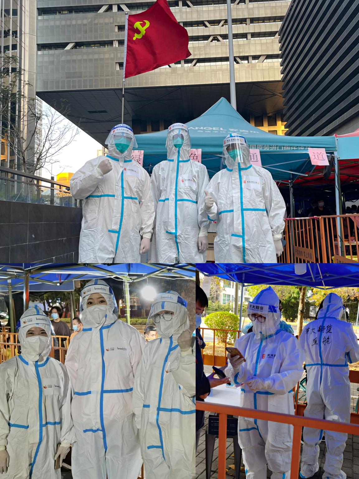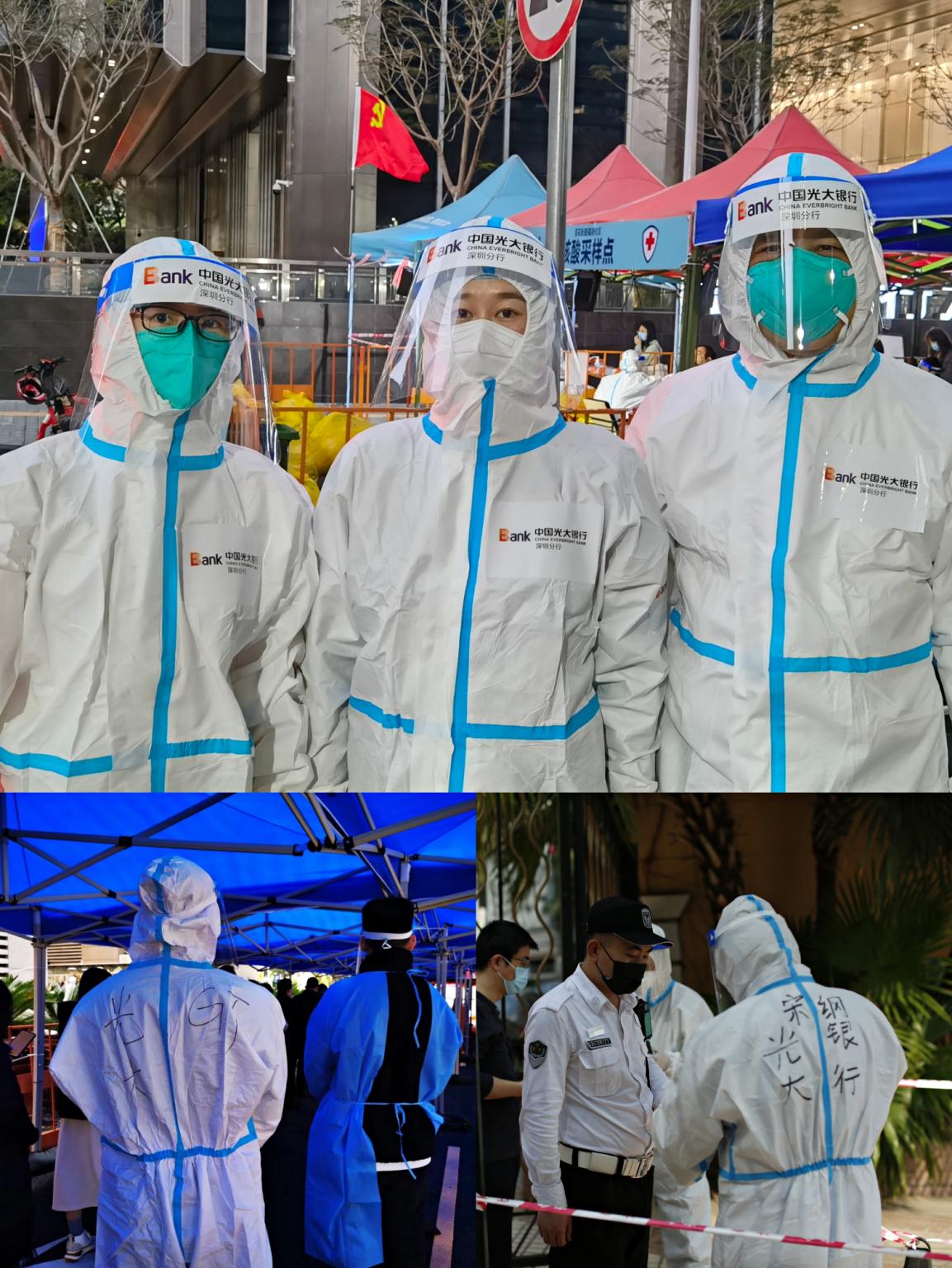 在疫情防控的關(guān)鍵時(shí)期,深圳分行黨委堅(jiān)決貫徹落實(shí)當(dāng)?shù)卣姆揽匾螅中悬h委書記、行長(zhǎng)韓學(xué)智同志緊急召開黨委會(huì)議,啟動(dòng)應(yīng)急預(yù)案,積極部署并投入疫情防控工作,確保日常營(yíng)運(yùn)和客戶服務(wù)等工作有序運(yùn)轉(zhuǎn)。在深圳福田區(qū)金融工作局的組織與號(hào)召下,分行黨委要求全體黨員干部發(fā)揮先鋒模范作用,主動(dòng)為社區(qū)疫情防控工作提供志愿服務(wù)。分行黨委委員們率先垂范,分頭帶領(lǐng)黨員干部奔赴社區(qū)慰問(wèn)抗戰(zhàn)一線工作人員,并犧牲周末休息時(shí)間深入社區(qū)核酸采樣點(diǎn),脫下西裝變身“大白”。深圳分行各黨支部和團(tuán)支部先后組織開展各類志愿服務(wù)累計(jì)時(shí)長(zhǎng)超過(guò)100小時(shí),活躍在防疫抗疫一線的同志們?cè)谌ΡU蠌V大群眾金融服務(wù)需求的同時(shí),和醫(yī)護(hù)工作者一同守護(hù)著千家萬(wàn)戶。作為集團(tuán)駐深企業(yè)協(xié)同工作的牽頭單位,分行牽頭組建駐深企業(yè)志愿者先鋒隊(duì),緊急投身福田區(qū)抗擊疫情的各個(gè)戰(zhàn)線和各個(gè)角落,不分晝夜、不論疲倦、以實(shí)際行動(dòng)踐行初心、使命和擔(dān)當(dāng),弘揚(yáng)新時(shí)代共產(chǎn)黨人的奉獻(xiàn)精神?!叭绻皇怯H身體驗(yàn)志愿者服務(wù)工作,永遠(yuǎn)不知道抗疫人員的工作是如此辛苦!有多少人在負(fù)重前行才確保了深圳市民有序和安寧的生活。此刻很想擁抱可親可敬的你們,防護(hù)服雖然阻擋了我們的擁抱,但無(wú)法阻擋我們一起抗擊疫情的心?!币晃恢驹刚哌@樣記錄到。