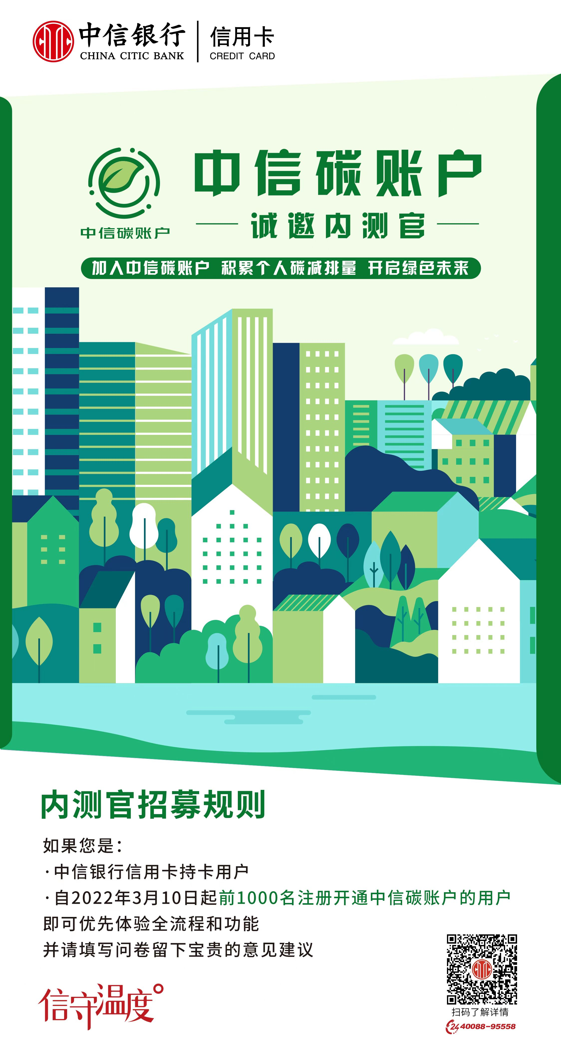 時值中國植樹節(jié)前夕,“中信碳賬戶”內(nèi)測版現(xiàn)已上線,于3月10日起公開招募1000名用戶參與內(nèi)測版體驗,首批體驗官登錄中信銀行信用卡“動卡空間”APP,即可在線開通個人碳賬戶,獲取關(guān)聯(lián)個人低碳行為的碳減排量,并可對碳賬戶的內(nèi)測版功能提供優(yōu)化建議。據(jù)中信銀行相關(guān)負(fù)責(zé)人介紹,目前,內(nèi)測版已經(jīng)上線生活繳費網(wǎng)上辦理(含水費、電費、燃?xì)赓M等)、申請電子信用卡、開通電子賬單等低碳行為的碳減排量核算。即將上線的公開版還將包含綠色出行、二手回收等更豐富的綠色低碳生活場景。