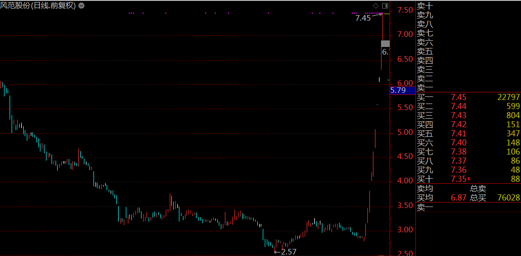 風(fēng)范股份自去年12月26日以來(lái)已連續(xù)獲得10個(gè)漲停,股價(jià)一路飆升至7.45元,成為A股新妖王。