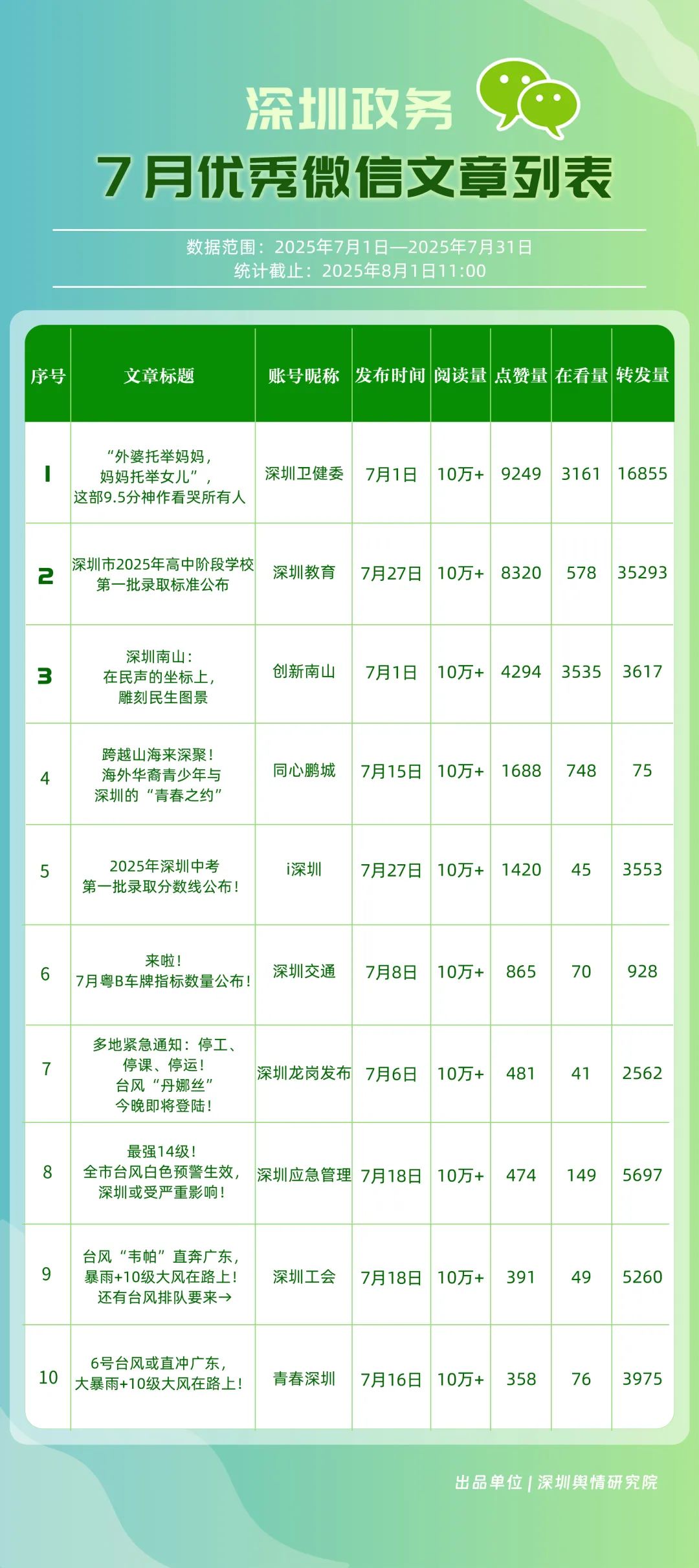 7月,30個政務(wù)微信公眾號入選“深圳優(yōu)秀政務(wù)微信公眾號”榜單,其中包括“深圳衛(wèi)健委”“深圳龍崗發(fā)布”“幸福福田”“創(chuàng)新南山”“i深圳”“深圳教育”“青春深圳”“深圳工會”“深圳光明”“濱海寶安”等。7月,“深圳衛(wèi)健委”內(nèi)容專業(yè)性與傳播力優(yōu)勢穩(wěn)固,整體表現(xiàn)保持較高水平,位于榜首;“深圳龍崗發(fā)布”聚焦民生服務(wù)與區(qū)域活動宣傳,實(shí)現(xiàn)傳播效果提升,位居第二;“幸福福田”表現(xiàn)同樣不俗,排名第三?!皠?chuàng)新南山”“深圳教育”“深圳工會”等也積極發(fā)布高質(zhì)量信息與服務(wù)內(nèi)容,能夠較好平衡內(nèi)容“質(zhì)”與“量”,排名有所提升。上榜微信公眾號依托特色優(yōu)勢深耕內(nèi)容創(chuàng)作,將優(yōu)質(zhì)內(nèi)容作為核心支撐,成為政務(wù)傳播領(lǐng)域的優(yōu)秀典范。