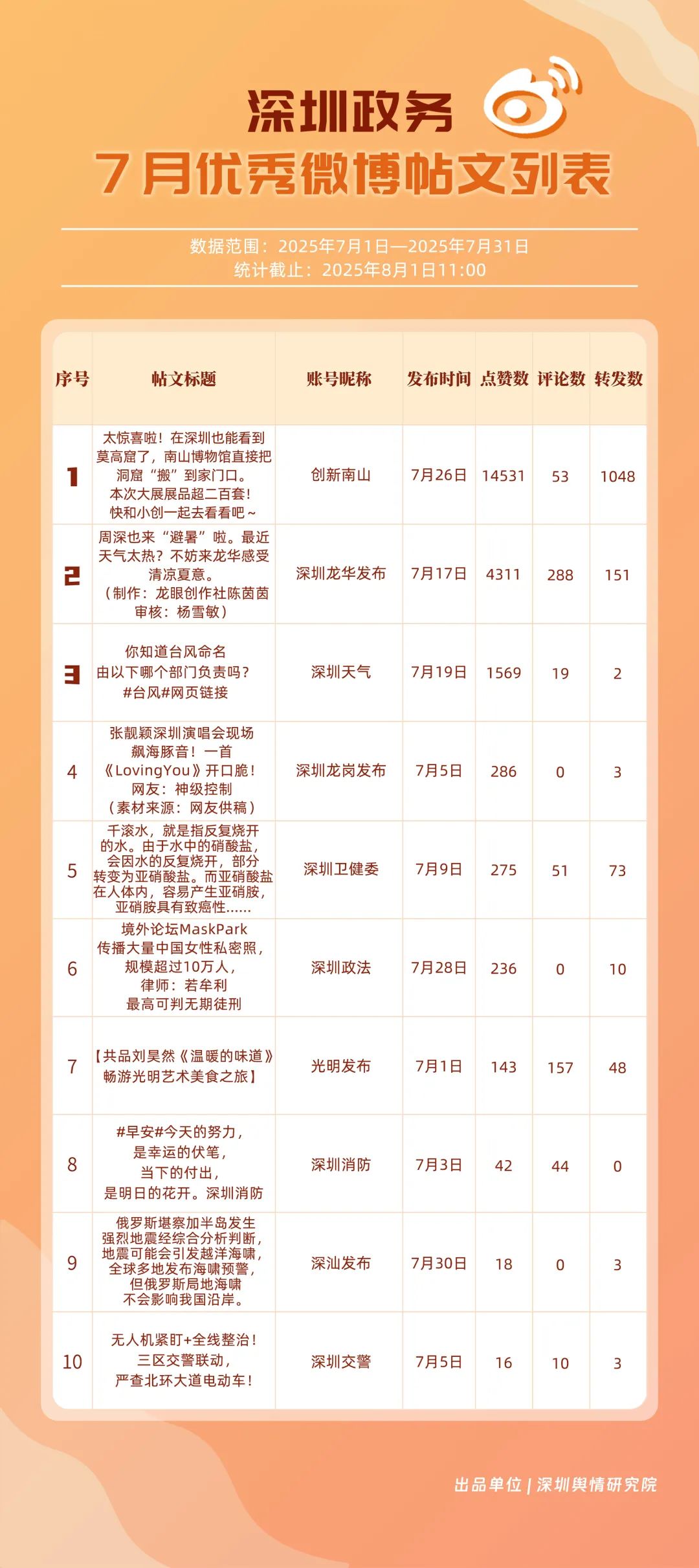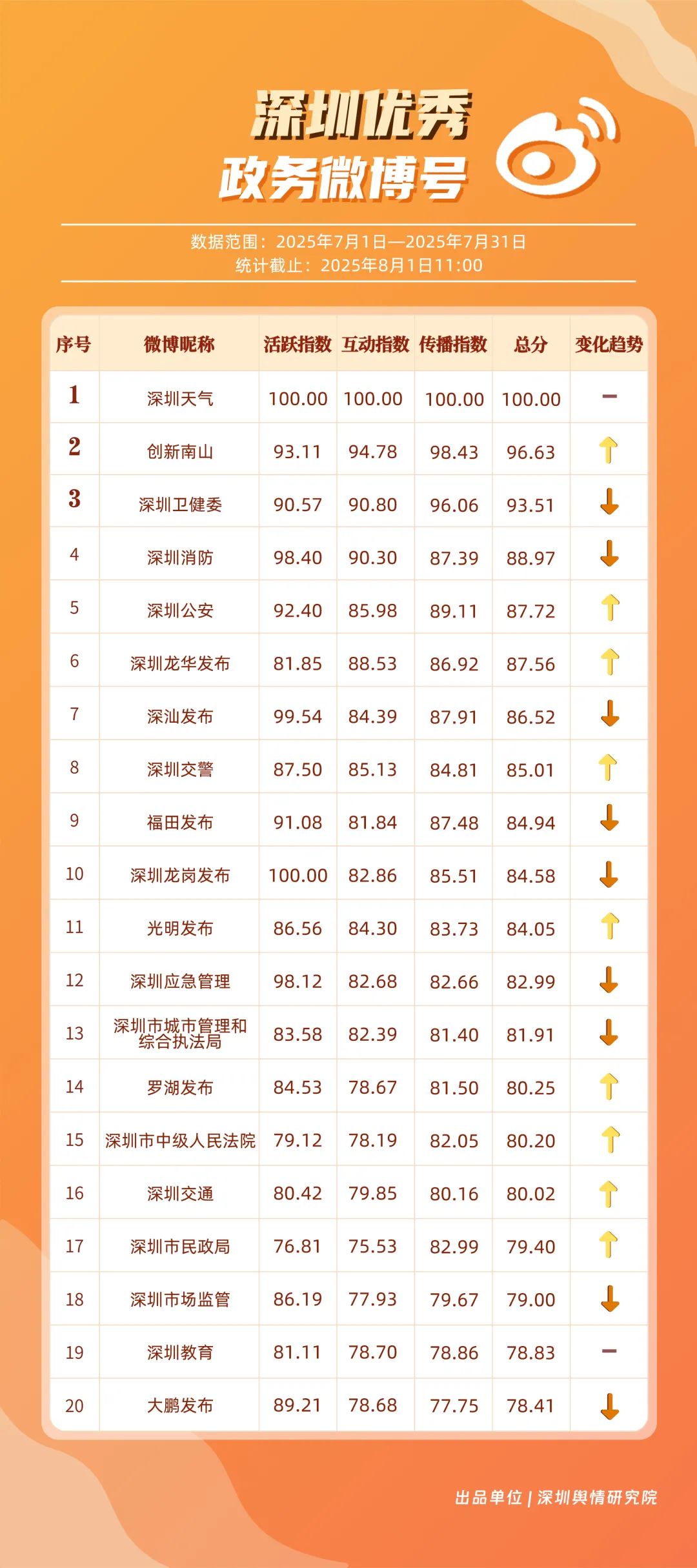 7月,“深圳天氣”“創(chuàng)新南山”“深圳衛(wèi)健委”“深圳消防”“深圳公安”“深圳龍華發(fā)布”“深汕發(fā)布”“深圳交警”“福田發(fā)布”“深圳龍崗發(fā)布”等20個賬號入選“優(yōu)秀政務(wù)微博號”。其中,“深圳天氣”以活躍、互動、傳播指數(shù)三項(xiàng)滿分,蟬聯(lián)榜首;“創(chuàng)新南山”以總分96.63躍居第二,排名呈上升趨勢;“深圳衛(wèi)健委”位列第三,評分也在90分以上,其科普信息持續(xù)獲得市民廣泛認(rèn)可。以上優(yōu)秀的政務(wù)微博賬號精準(zhǔn)貼合平臺的傳播規(guī)律,用獨(dú)特的賬號風(fēng)格展現(xiàn)各自特色與魅力。
