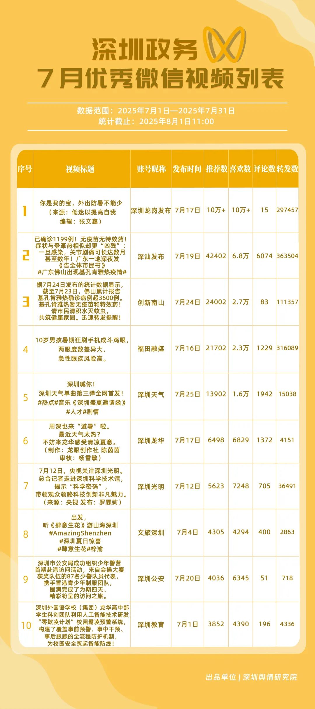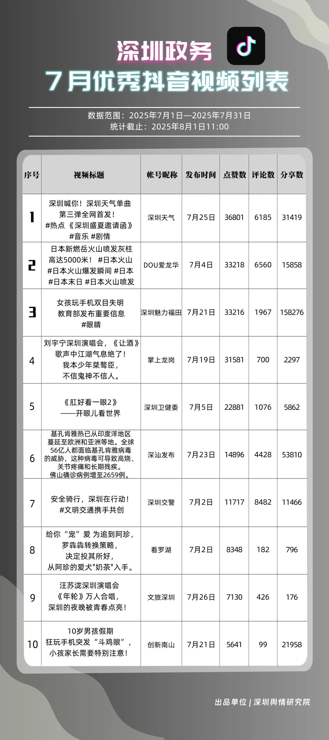 7月,“深圳天氣”“DOU愛龍華”“深圳魅力福田”“深汕發(fā)布”“掌上龍崗”“創(chuàng)新南山”“深圳交警”“文旅深圳”“深圳衛(wèi)健委”“深圳普法”共10個政務(wù)抖音號獲得“優(yōu)秀政務(wù)抖音號”稱號。其中,“深圳天氣”互動指標(biāo)獲滿分,憑借氣象與趣味相結(jié)合的創(chuàng)新科普形式,領(lǐng)跑優(yōu)秀政務(wù)抖音號;“DOU愛龍華”“深圳魅力福田”分別位列第二、三名,通過聚焦網(wǎng)絡(luò)熱點(diǎn)、挖掘創(chuàng)意內(nèi)容,不斷提升傳播效能,展現(xiàn)出強(qiáng)大的政務(wù)新媒體影響力;“深汕發(fā)布”“掌上龍崗”“創(chuàng)新南山”等賬號緊隨其后,上榜的優(yōu)質(zhì)政務(wù)抖音號用短視頻語言強(qiáng)化傳播效果,展現(xiàn)了鮮明的賬號特色和風(fēng)采。