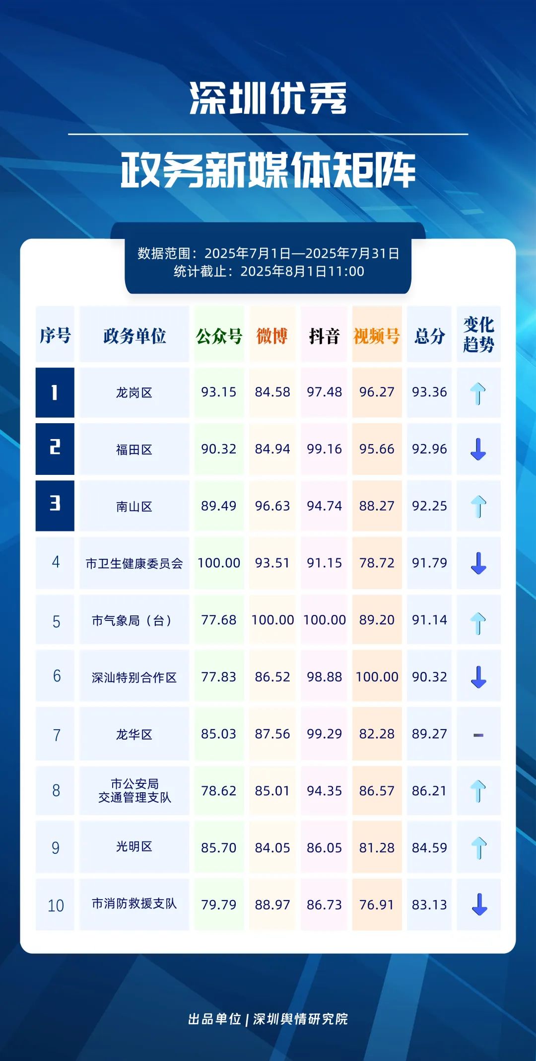 7月,深圳政務(wù)新媒體矩陣各展所長,為市民帶來豐富實(shí)用的信息服務(wù)。龍崗區(qū)、福田區(qū)、南山區(qū)、市衛(wèi)生健康委員會、市氣象局(臺)、深汕特別合作區(qū)、龍華區(qū)、市公安局交通管理支隊(duì)、光明區(qū)、市消防救援支隊(duì)的新媒體矩陣入選“深圳優(yōu)秀政務(wù)新媒體矩陣”榜單。值得關(guān)注的是,龍崗區(qū)新媒體矩陣在7月著力提升內(nèi)容質(zhì)量,于抖音和微信視頻號平臺得分顯著提高,成功登頂;福田區(qū)新媒體矩陣在抖音平臺表現(xiàn)突出,位列榜單第二;南山區(qū)新媒體矩陣則在微博和抖音平臺保持評分優(yōu)勢。此外,市氣象局(臺)、市公安局交通管理支隊(duì)和光明區(qū)的排名也實(shí)現(xiàn)明顯上升,體現(xiàn)出政務(wù)新媒體矩陣整體競爭力持續(xù)增強(qiáng)。