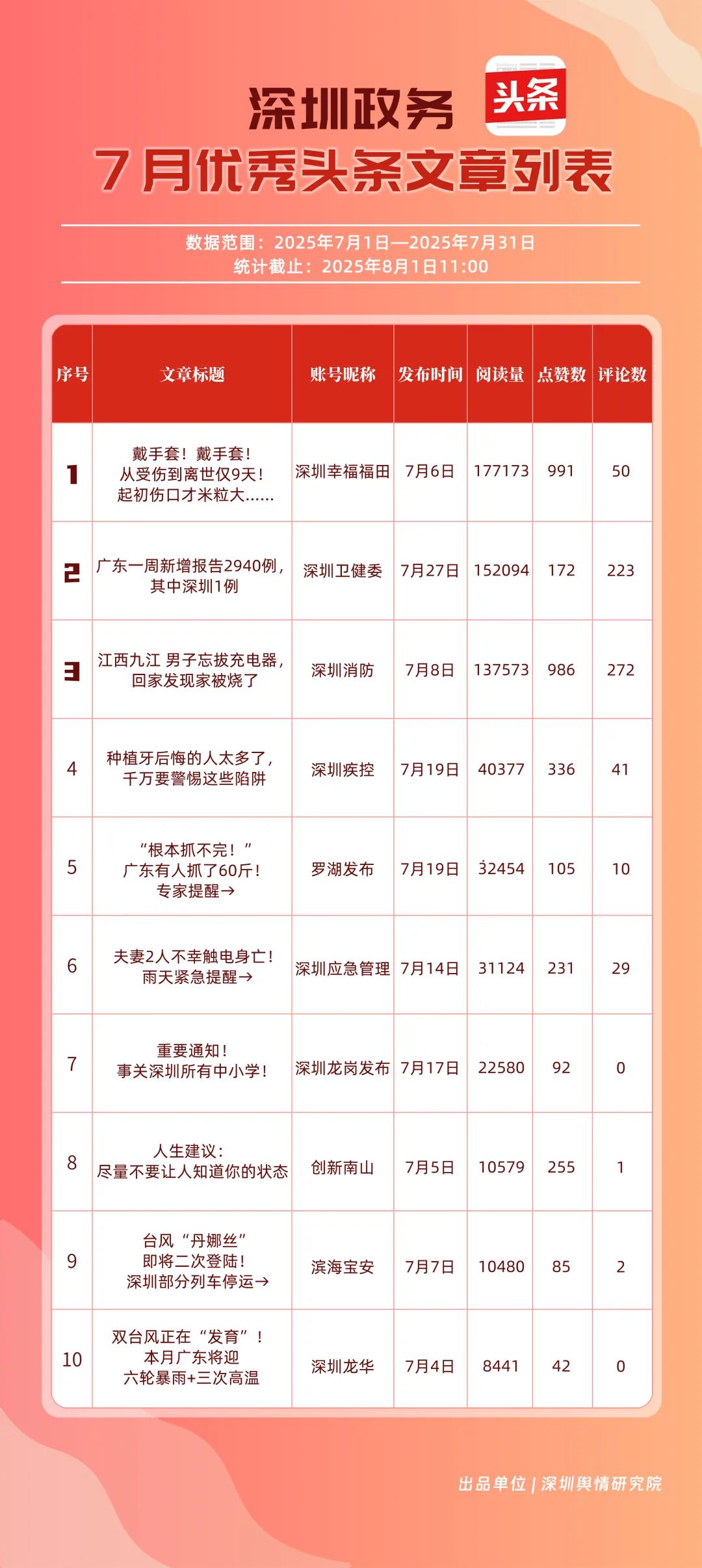 7月,“深圳幸福福田”“深圳消防”“深圳衛(wèi)健委”“深圳疾控”“創(chuàng)新南山”“羅湖發(fā)布”“深圳應(yīng)急管理”“濱海寶安”“深圳龍崗發(fā)布”“坪山發(fā)布”共10個政務(wù)頭條號入選“優(yōu)秀政務(wù)頭條號”榜單?!吧钲谛腋8L铩薄吧钲谙馈睉{借優(yōu)質(zhì)內(nèi)容持續(xù)吸引用戶關(guān)注,穩(wěn)居前二;“深圳衛(wèi)健委”表現(xiàn)亮眼,評分達(dá)92.68分,排名較6月有所上升;“深圳疾控”同樣進(jìn)步明顯,在疾病預(yù)防控制信息傳播上發(fā)揮了重要作用?!皠?chuàng)新南山”“羅湖發(fā)布”“深圳應(yīng)急管理”等上榜賬號,也各展所長,始終將優(yōu)質(zhì)內(nèi)容作為核心抓手,成為政務(wù)新媒體領(lǐng)域內(nèi)容創(chuàng)作與傳播的典范。