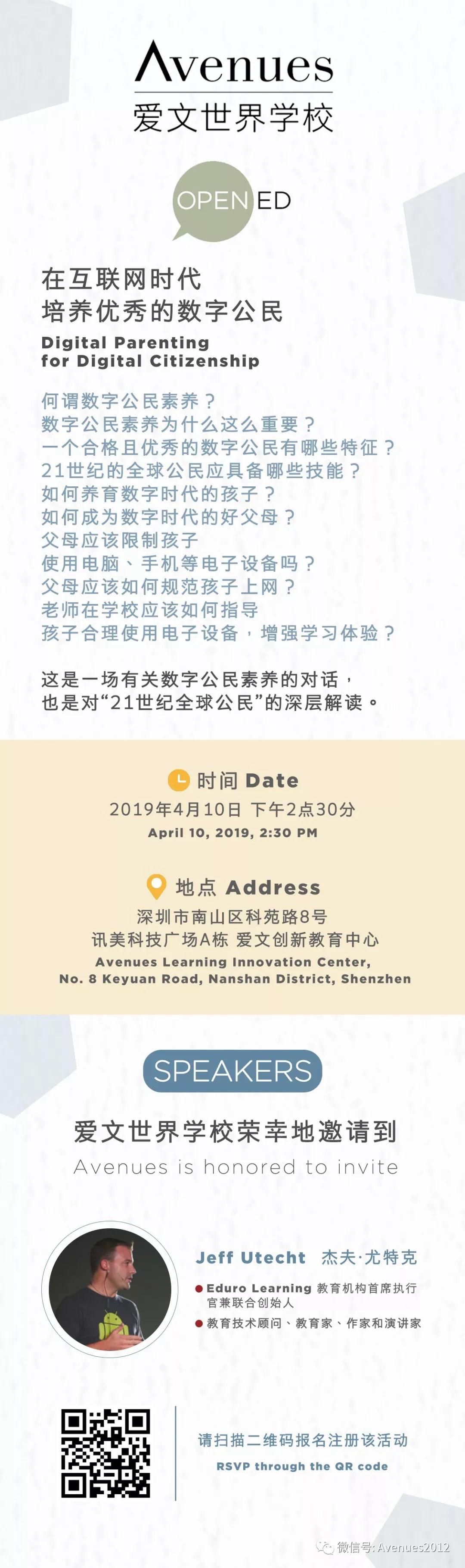 愛文世界學(xué)校專門邀請了知名的教育技術(shù)顧問、教育家、作家及演講家杰夫?尤特克 (Jeff Utecht),就數(shù)字公民素養(yǎng)話題進行深入探討,從何謂數(shù)字公民素養(yǎng),到數(shù)字公民素養(yǎng)的重要性,再到父母和老師如何培養(yǎng)孩子成為一位優(yōu)秀的數(shù)字公民。