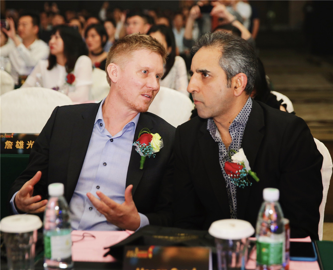 △中央美術(shù)學(xué)院建筑設(shè)計研究院院長、博士生導(dǎo)師王鐵,美國Gensler上海公司總監(jiān)Hasan Syed為廣州設(shè)計師黃永才頒發(fā)“最佳娛樂空間設(shè)計獎”