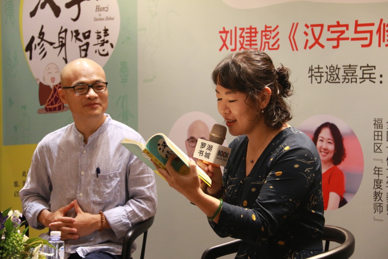 活動由深圳書城羅湖城張華女士主持,邀請到壹讀書會創(chuàng)始人、知名閱讀推廣人、 《漢字與修身智慧》作者劉建彪先生和全國十佳文學(xué)教師、廣東省閱讀推廣“點燈人”譚妙蓉女士擔(dān)任對話嘉賓,為聽眾講述漢字的起源以及他們根據(jù)切身體會對漢字的解讀。