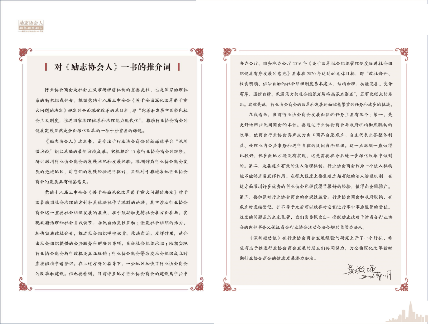 清華大學(xué)公益慈善研究院王名教授為此書作序中寫道:感謝深圳,孕育出了中國改革開放和市場經(jīng)濟發(fā)展中最發(fā)達的協(xié)會;感謝深圳的協(xié)會,為一批優(yōu)秀的協(xié)會人提供了人生和事業(yè)的舞臺。
