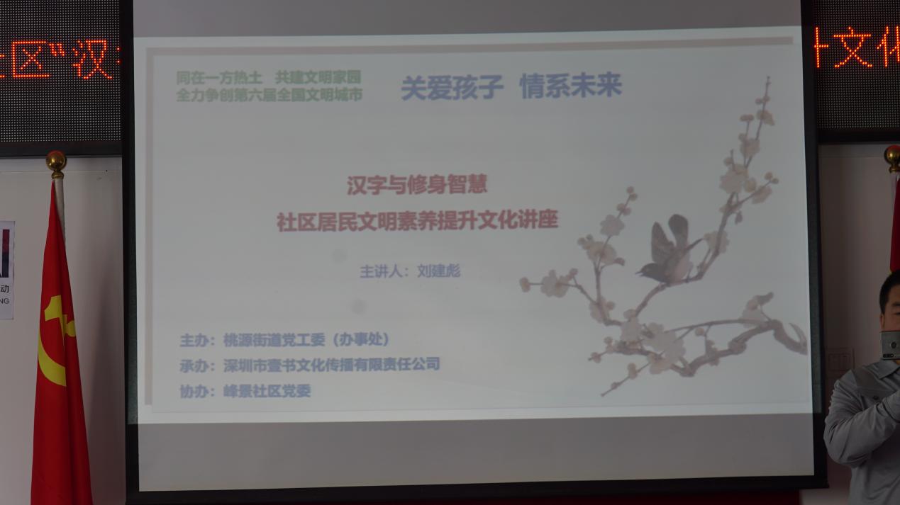 11月8日下午,該項目首場講座在峰景社區(qū)工作站拉開了序幕,本次講座由桃源街道黨工委(辦事處)主辦、深圳市壹書文化傳播有限責(zé)任公司承辦、峰景社區(qū)黨委協(xié)辦,邀請到壹讀書會創(chuàng)始人、知名閱讀推廣人、《漢字與修身智慧》的作者劉建彪擔(dān)任主講嘉賓。在深圳爭創(chuàng)全國文明城市的當(dāng)下,桃源街道辦積極響應(yīng)市委市政府的號召,不斷探索籌劃、推陳出新,以“‘同在一方熱土共建文明家園’——全力爭創(chuàng)第六屆全國文明城市”為文明創(chuàng)建標(biāo)語,開展題為“學(xué)習(xí)漢字與修身智慧,以傳統(tǒng)文化力量促文明”的文化講座,為創(chuàng)建文明城市貢獻一份力量。