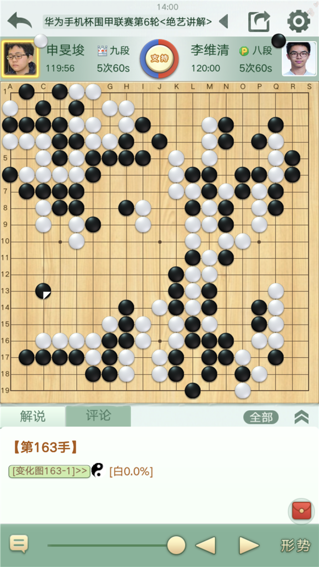 第二臺,申旻俊主將對陣?yán)罹S清。右上作戰(zhàn)黑棋下出了一子解雙征的妙手,白棋應(yīng)對失誤大虧損。