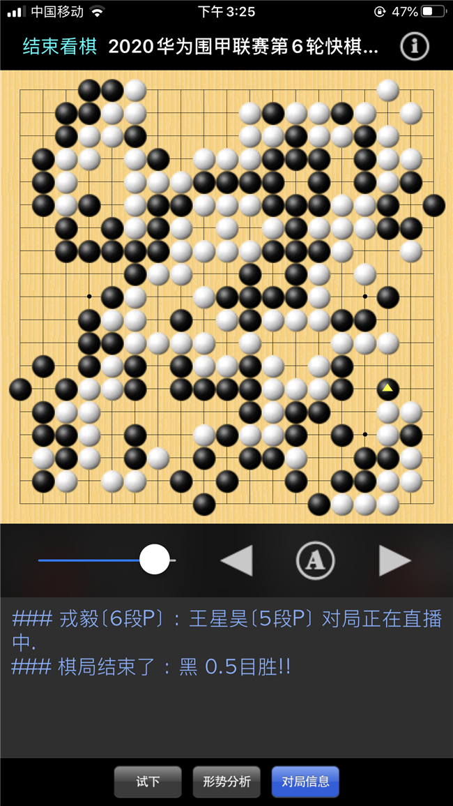 誰料做活上面大龍時候失誤導(dǎo)致右邊被白吃掉,結(jié)果以幸運的3/4子獲勝。