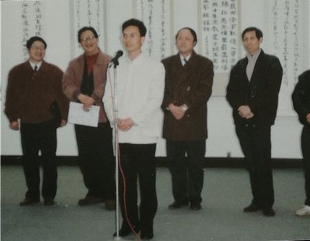 1996年組織深圳市青年書法家赴江蘇省美術館舉辦《深圳青年書法展》。這是深圳特區(qū)成立以來深圳青年書法家第一次到外省集體亮相交流,圖為金龍在開幕式上致詞。